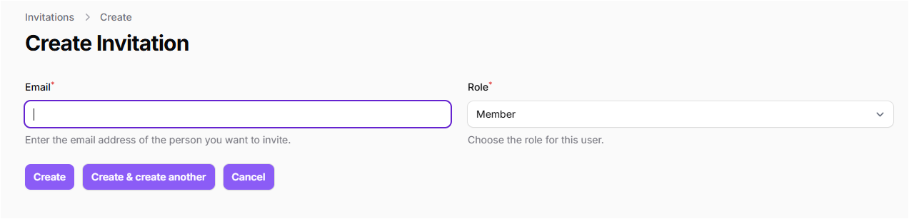 : Mengirim undangan ke pengguna yang dituju. Pengguna yang telah diinvite dapat melihat informasinya pada menu Invitations dan juga email pengguna.Create & Create another