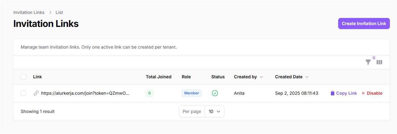 : Pilih peran default yang akan diberikan kepada setiap pengguna yang bergabung melalui tautan ini. Berikut adalah penjelasan untuk setiap peran yang tersedia:Peran (Role) | Deskripsi |
